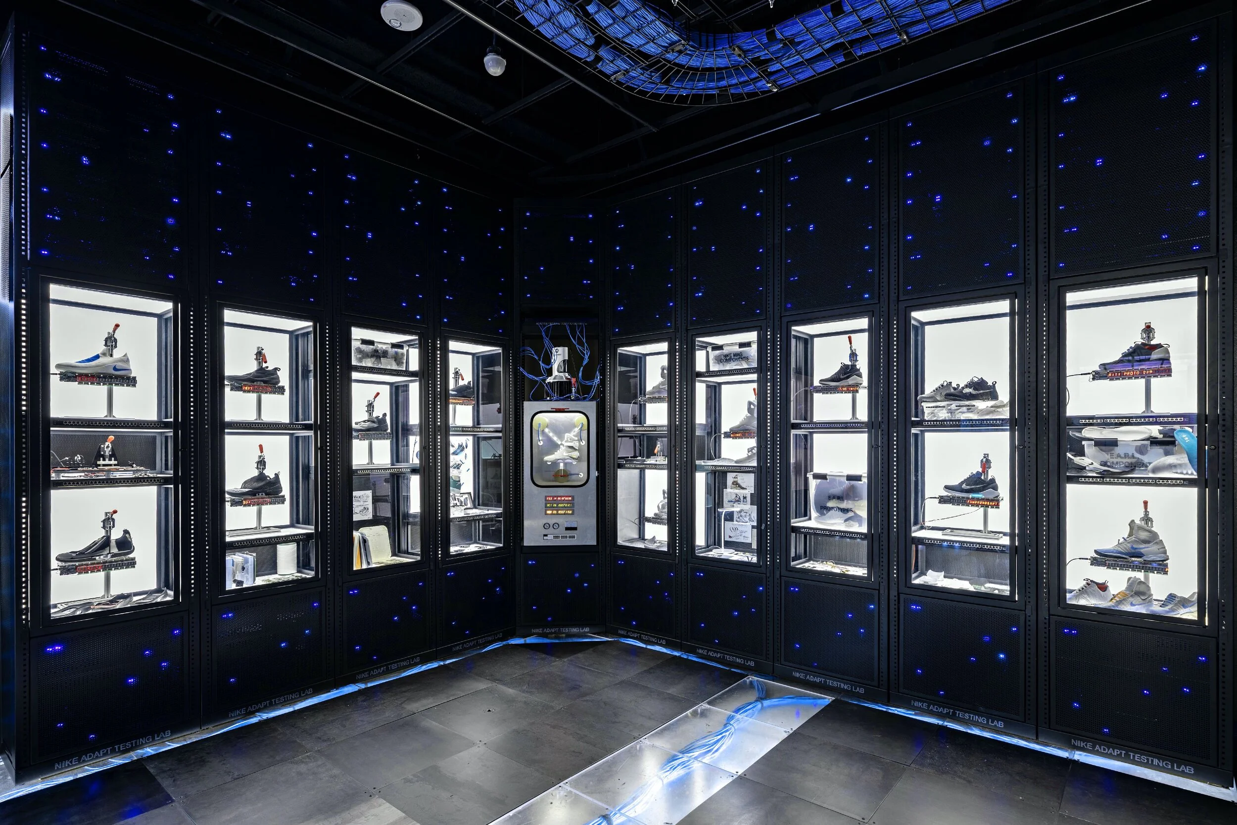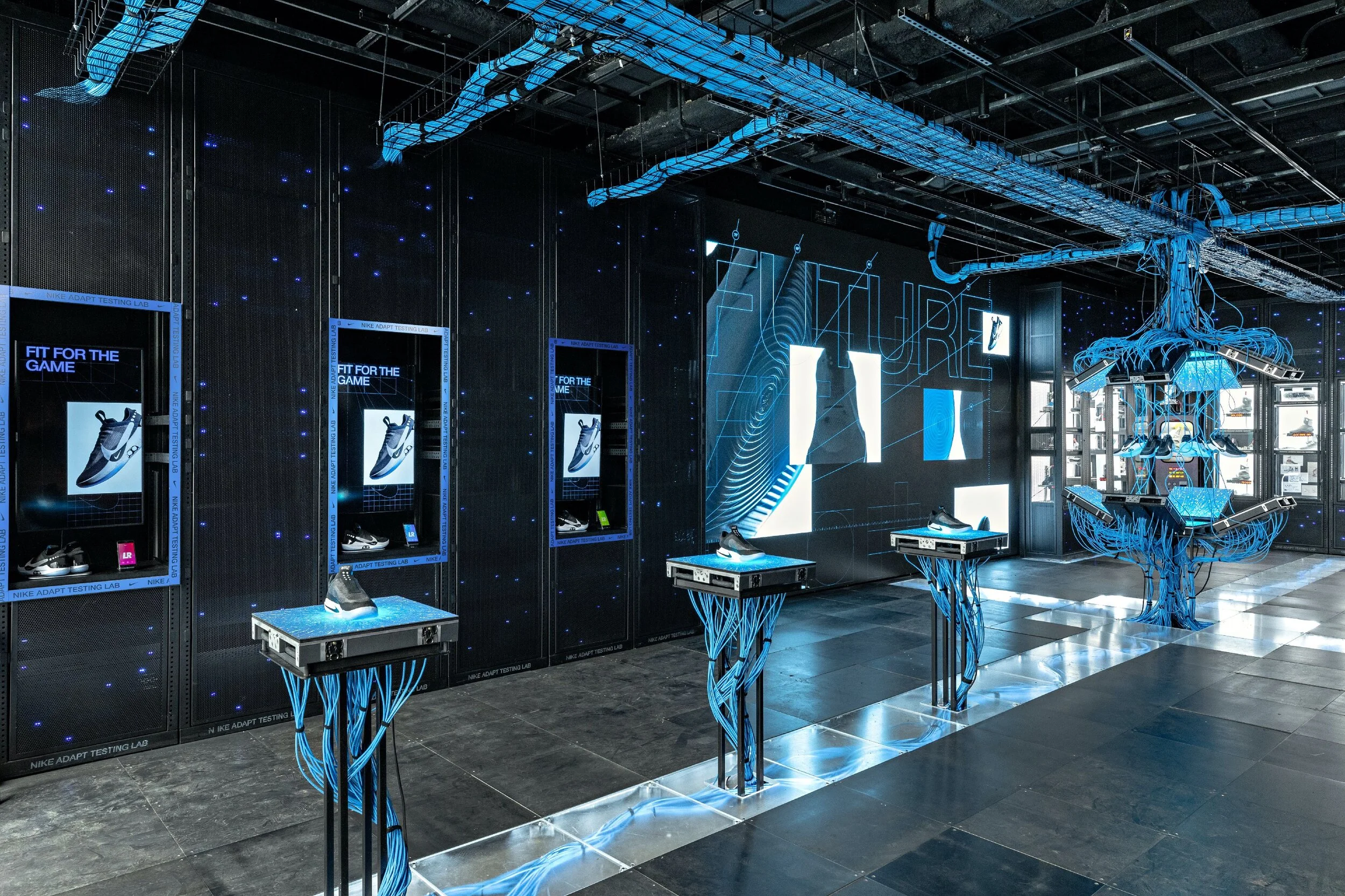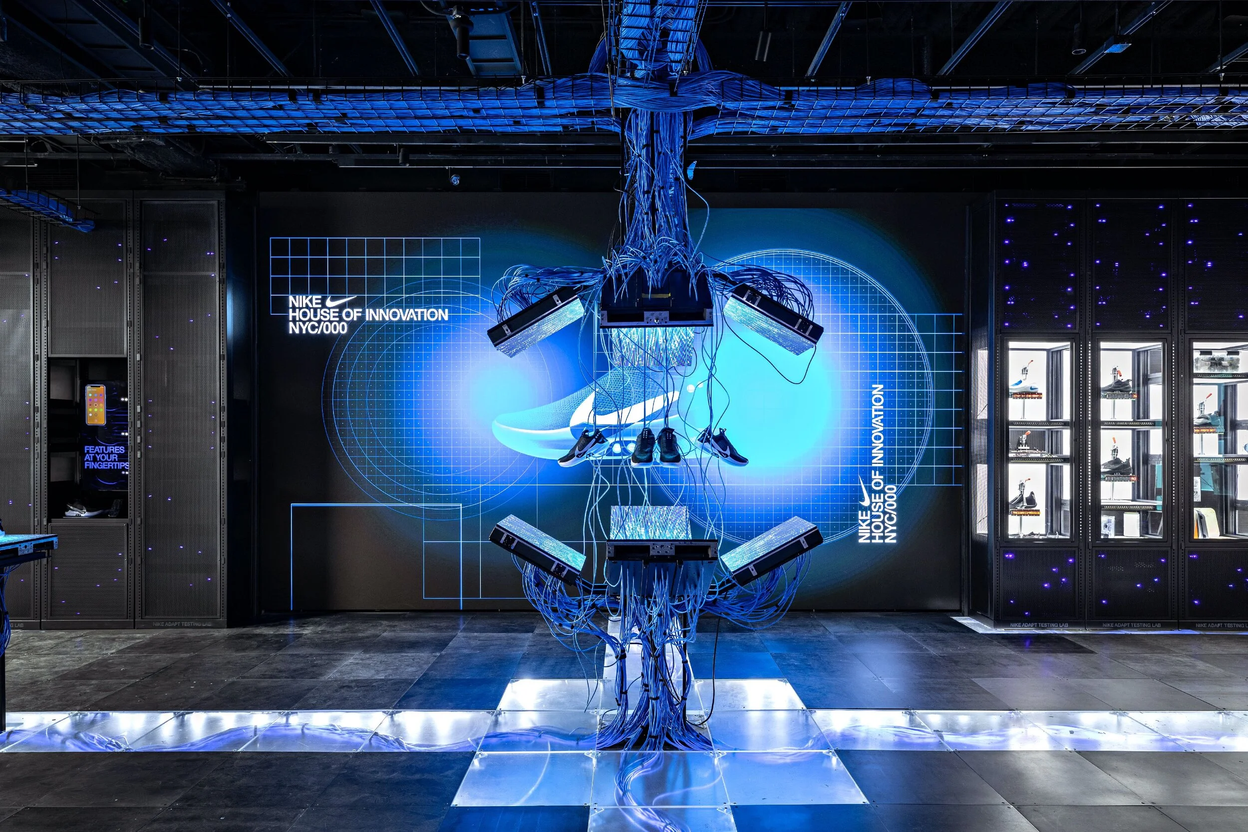 The entire first floor of the House of Innovation NYC was transformed into the Nike Adapt Testing Lab, where consumers could access rare prototypes and participate in an interactive basketball trial experience. This featured a digital half-court displaying responsive drills, player positioning, and real-time data visualizations to enhance the basketball experience.